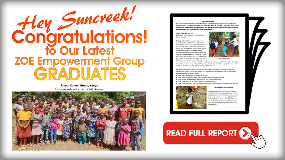 View Latest Report from ZOE Group One View Latest Report from ZOE Group Two Janet Hunt, Marjorie McAloon, and Tracy Ullman represented Suncreek UMC in Kenya in July to witness the amazing work that the members of our three ZOE working groups are doing to become self-sufficient and empowered. The members of the working groups are learning amazing skills, trades, or our working hard in school. The amount of pride they have in their accomplishments and the love they have for Suncreek for giving the support so they can succeed is beyond words. Each of them feels our support and love and want to make us proud of their accomplishments. It is amazing what three years through the ZOE ministry can do to change the lives of so many. The mission team was also able to meet our newly formed and brand new working group and see the hope in their eyes for their futures.